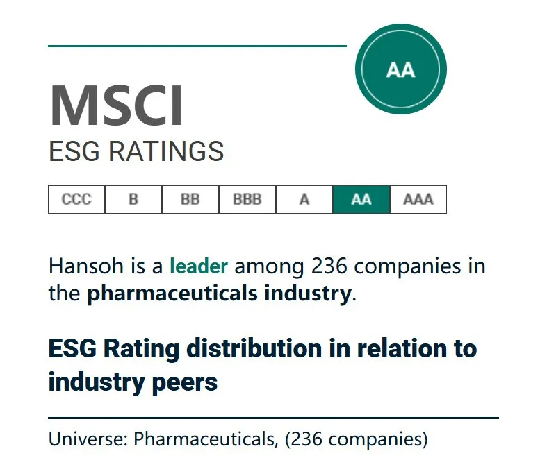 近日,国际权威指数机构MSCI(明晟,Morgan Stanley Capital International)公布2024年环境、社会及管治(英文简称“ESG”)评级结果,翰森制药ESG评级连续两年获评“AA”级,保持全球同行领先水平。
